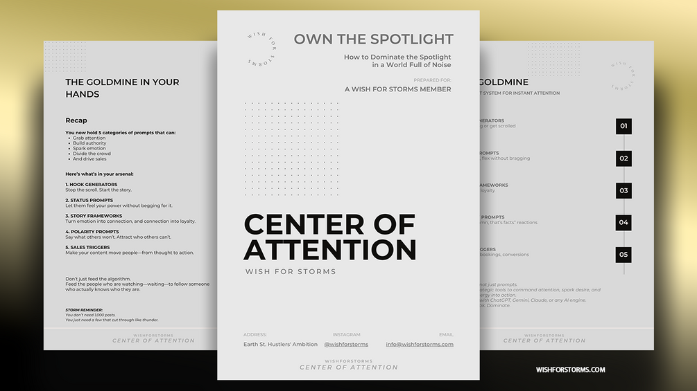 28+ Page Premium PDF — “Center of Attention” full digital guide The Visibility Code — 5 magnetic traits of attention-commanding brands The Storm Strategy — Whisper → Wave → Wind → Win (your action plan) The Goldmine — AI prompt vault for hooks, sales, authority & story Platform Playbook — Instagram, TikTok, Twitter/X tactics that hit Bold CTA formulas — Content that actually gets clicks, not just likes Mic-drop quotes — For content, captions & mindset shifts Instant Download — PDF ready to use on phone, tablet or desktop Lifetime access — Re-download anytime from your Gumroad library
